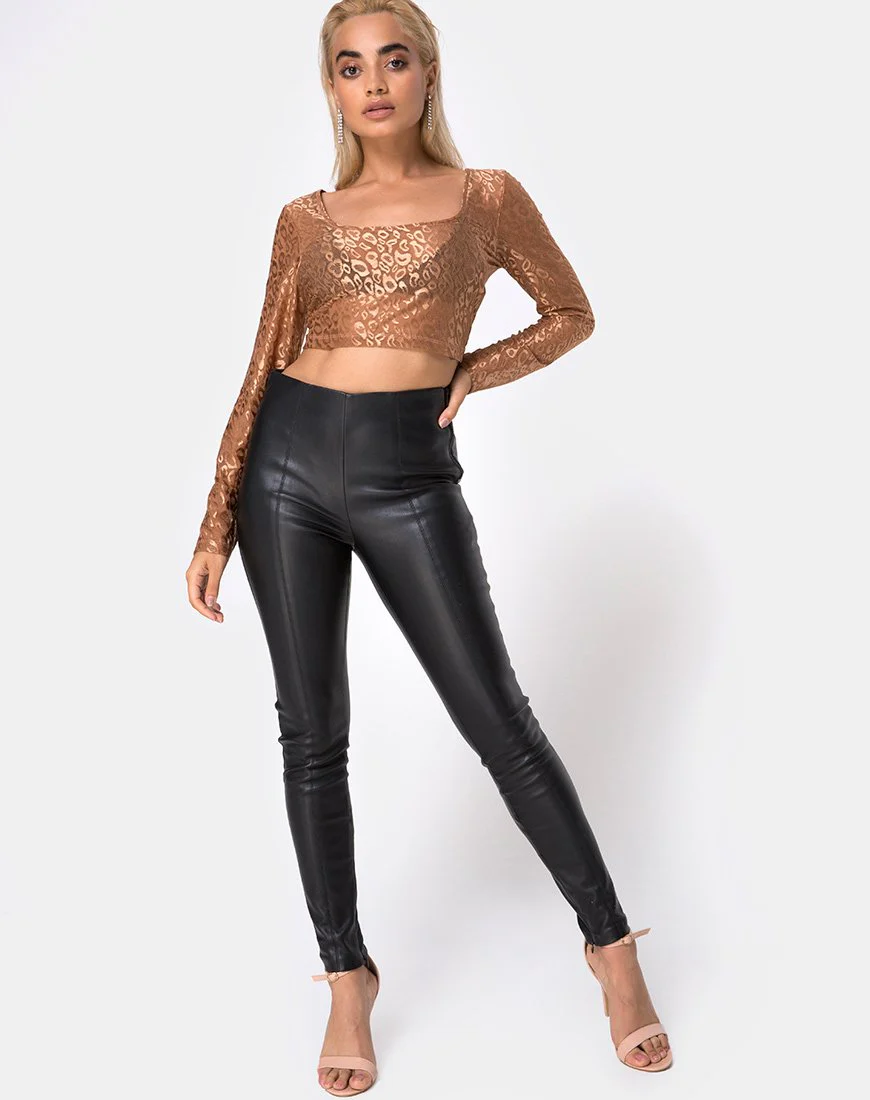 Need a little wardrobe pick me up? Top it up with the Bon crop, perfect for added some chic to your outfit. In a sheen caramel leopard, it features a cropped fit, square neckline and long sleeves. Pair it with a high waist trouser and slinky heel for weekend vibes.