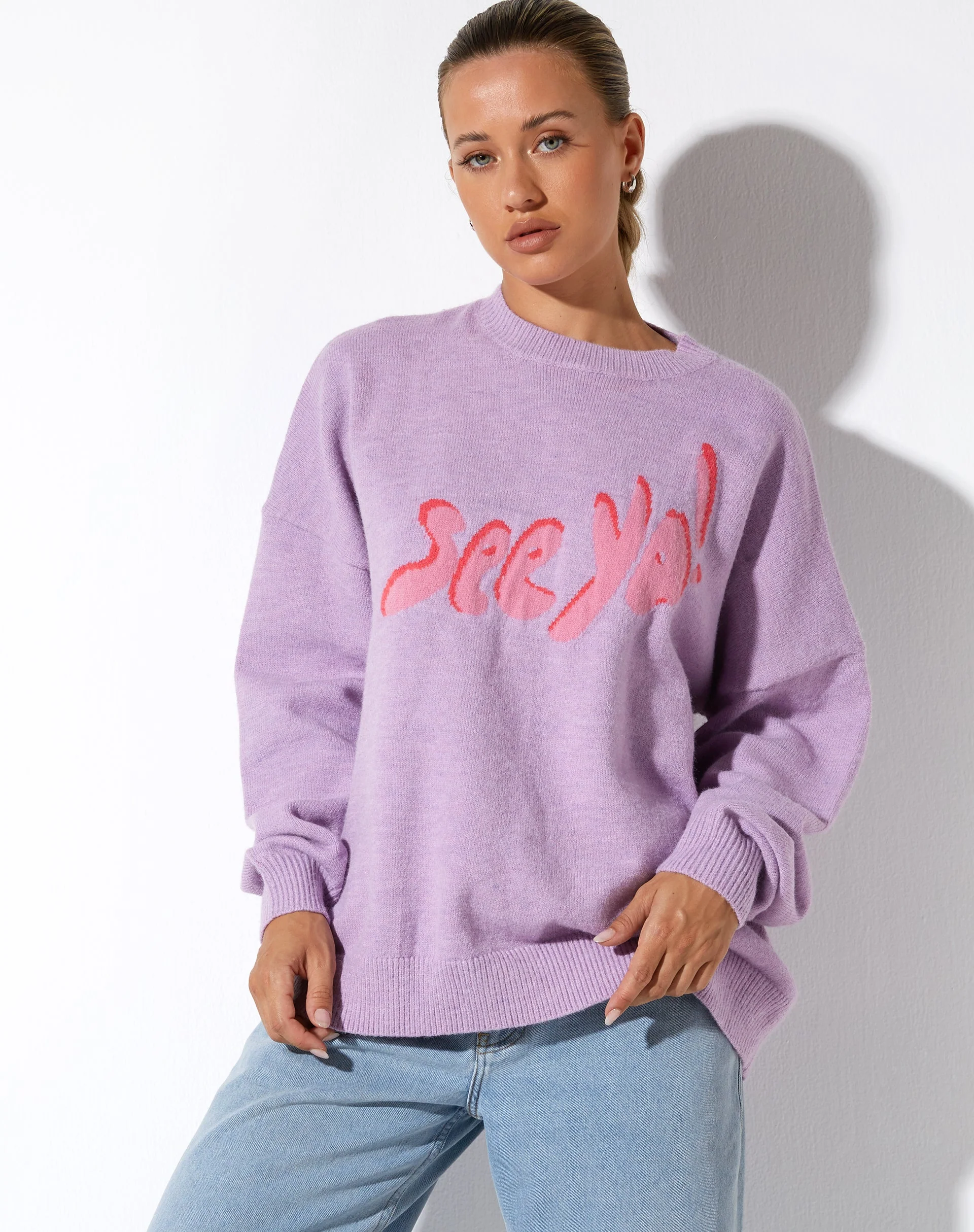 Our Jamin jumper is an essential to keep you warm this season. Featuring long sleeves, crew neckline and an oversized fit in a lilac purple with ‘see ya!’ design. Pair with the low rise Parallel jeans.